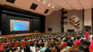 令和7年7月10日(木)、安城市民会館サルビアホールにて、「創立50周年記念GLS講演会」が本校生徒に向けて実施されました。GLSとはグローカル・スタディーズの略です。講師は九州大学大学院農学研究院 生命機能科学部門 水族生化学分野 教授である中尾実樹先生にご講演いただきました。中尾先生は本校2回生でいらっしゃいます。講演会には、PTA、同窓生、同窓会実行委員の方々もかけつけてくださいました。