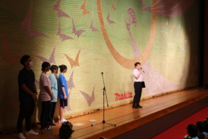 厳しい暑さの中、9月10日(水)に創立50周年記念芸術鑑賞会が実施されました。本校は音楽、古典芸能、演劇を年度ごとに鑑賞していますが、今年度は音楽で、ゴスペルボーカルグループ「StarLights」の音楽鑑賞を行いました。